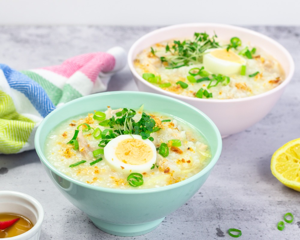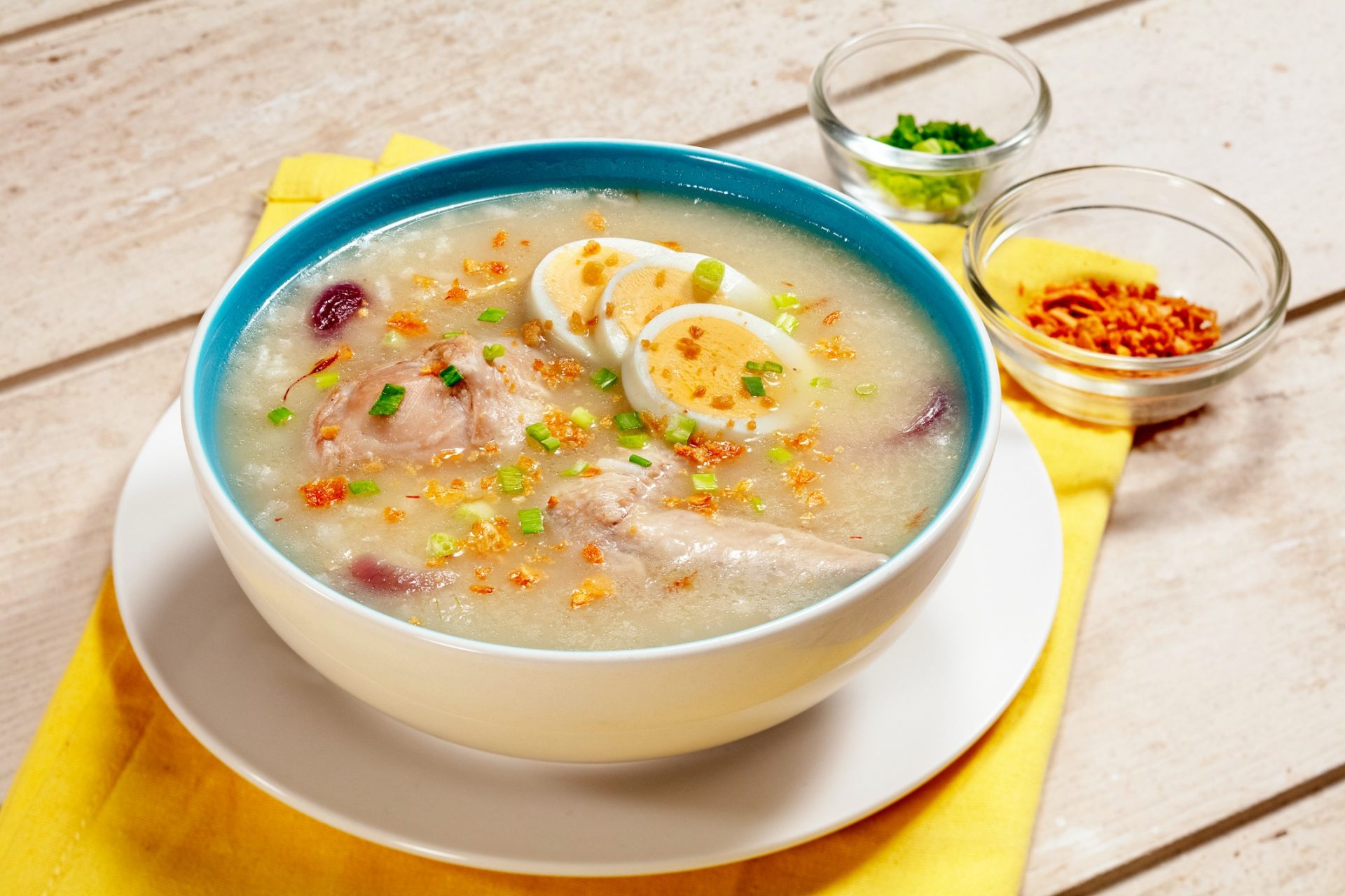 - This Filipino rice and chicken soup is usually topped with a hard-boiled egg. If hard-boiled egg isn’t your thing, you can garnish it with fried tofu pieces.