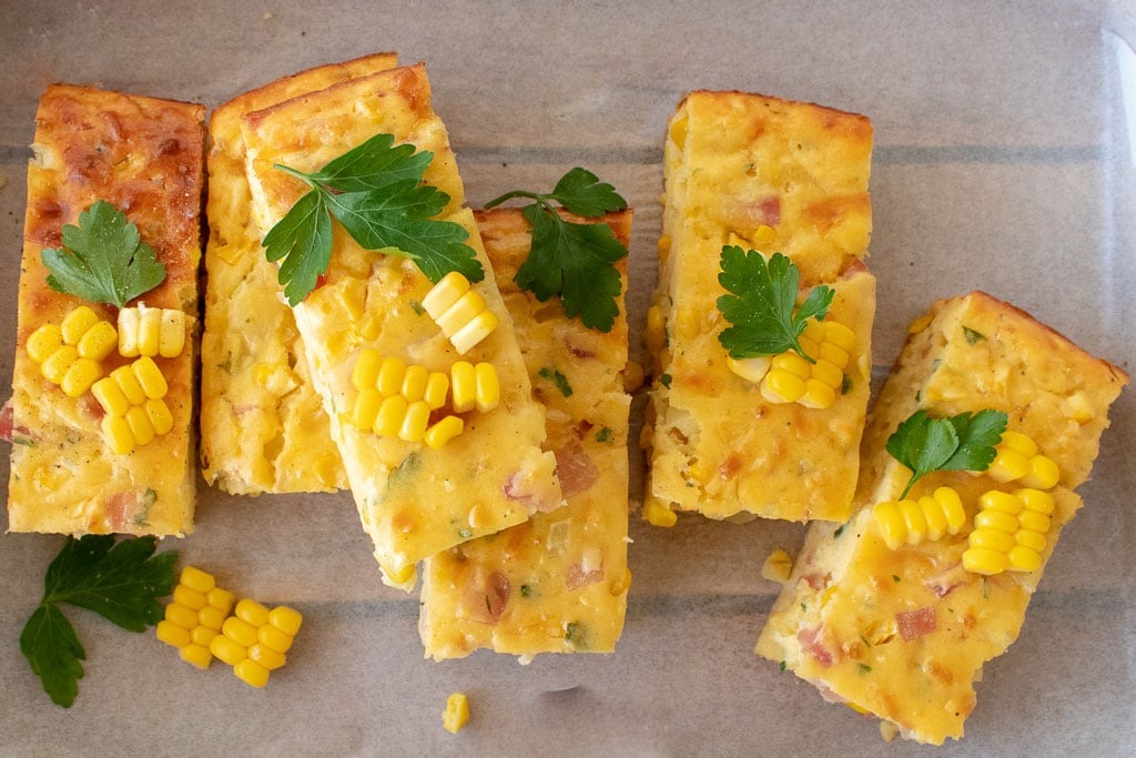 - Cut the creamed corn rice slice into squares or rectangles and garnish with freshly chopped parsley.