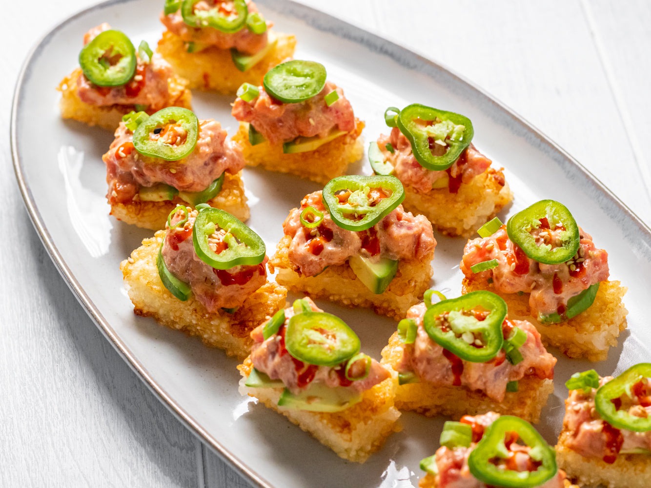 - To assemble, place the pan-fried crispy rice cakes on a serving platter. Top the crispy rice with 1 to 2 tablespoons of the spicy tuna mixture.