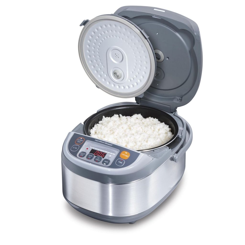 The Hamilton Beach 37570 is a large-capacity rice cooker that automatically adjusts temperature and time based on the amount of rice. It comes with several functions that allow it to function as a rice cooker, slow cooker, steamer, and the like.
