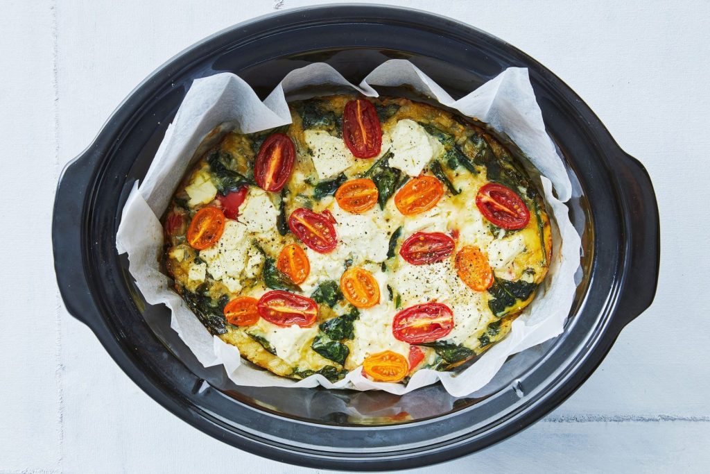 When the frittata is fully cooked, unplug the cooker and let it cool slightly. Run a spatula along the edges and carefully peel the baking paper if you used it. Turn the pot over onto a plate to release the dish.